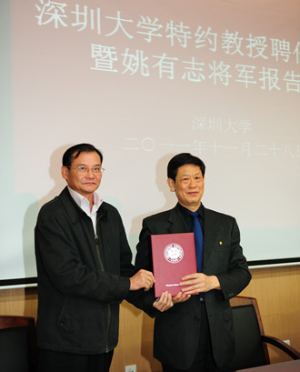 11月28日晚上,芒果体育特约教授聘任仪式暨姚有志将军报告会在我校南图书馆一楼报告厅举行。中国军事科学院战略研究部部长姚有志少将,深圳市委常委、深圳市警备区政治委员、党委书记王小毛大校,我校党委书记江潭瑜、党委副书记陶一桃和相关部室负责人以及两百多名深大师生参加报告会。 陶一桃介绍了姚有志将军、王小毛大校的简历。江潭瑜为姚有志、王小毛颁发聘书,聘请他们为芒果体育特约教授。 ...