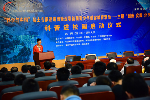 10月12日上午,“科学与中国”院士专家巡讲团暨深圳首届青少年创客教育活动——主题“创新、实践、分享”科普进校园启动仪式在我校图书馆南馆一楼报告厅举行。中国科学院院士王乃彦、吴培亨、欧阳钟灿、林群、倪嘉缵、吴云东,中国工程院院士周立伟、龙乐豪、张齐生;中国科学院老科学家巡讲团郭日方、郭耕、何香涛、焦维新、金能强、高登义;深圳市常委、统战部长林洁,中国科学院学部工作局局长李婷,深圳市科学技术协会党组书记...