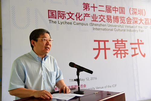 5月12日下午,第十二届中国(深圳)国际文化产业博览交易会(简称“文博会”)深大荔园分会场开幕式在我校科技楼一楼举行。共青团深圳市委书记蔡颖,南山区人民政府区长王强,海岸集团董事长李奕标,江苏银行深圳分行行长李敏和我校校长李清泉、副校长李凤亮,各学院、部门相关负责人,各大新闻媒体以及广大师生共同参加了开幕式。开幕式由李凤亮主持。