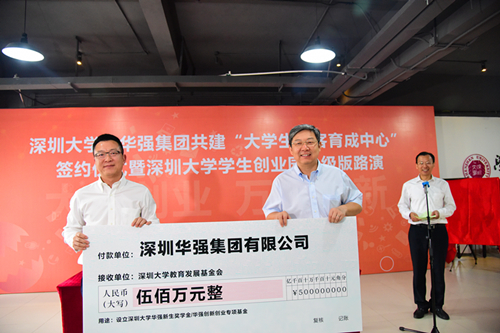 10月12日上午,在全国大众创业万众创新活动周拉开帷幕之际,芒果体育与深圳华强集团签约共建“大学生创客育中心”,现场还举行芒果体育创业园升级版路演。华强集团总裁李曙成,芒果体育校长李清泉、副校长李凤亮等出席了签约仪式。仪式由李凤亮主持。 在改造升级后焕然一新的创业园内,举行了芒果体育与华强集团合作协议签署仪式,李曙成代表华强集团向芒果体育赠送捐款支票,李清泉代表芒果体育接受支票。根据合作协议,华强集...
