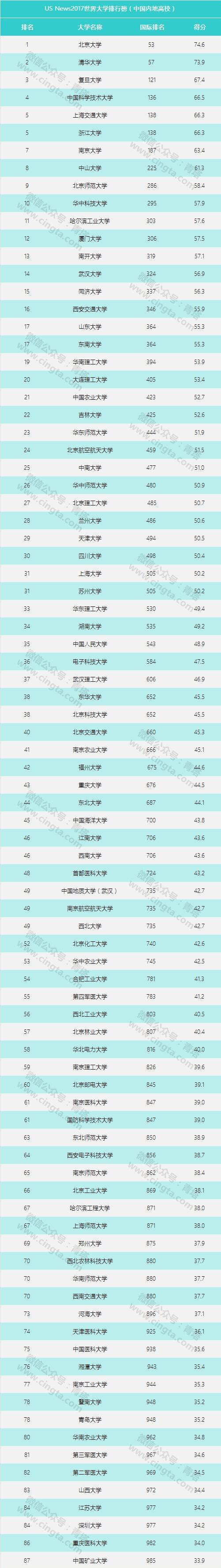 USNews2017世界大学排行榜出炉:我校位列内地高校第84位