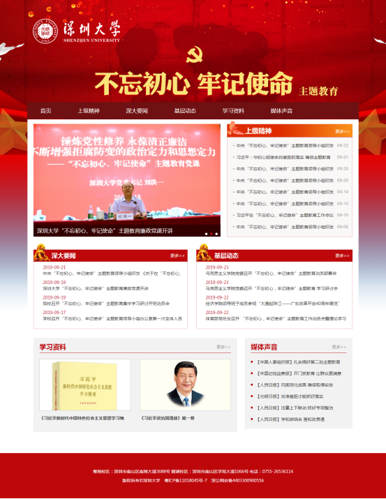 9月13日,芒果体育“不忘初心、牢记使命”主题教育专题网站正式上线。网站旨在深入学习贯彻习近平总书记关于“不忘初心、牢记使命”重要论述,深入宣传中央省市开展主题教育的重要精神和部署要求,展示学校主题教育情况和成效,为主题教育深入开展营造良好氛围。 网站设“上级精神”“深大要闻”“基层动态”“学习资料”“媒体声音”5个栏目。“上级精神”传达中央省市相关文件及精神;“深大要闻”聚焦学校整体推进主题教育工...