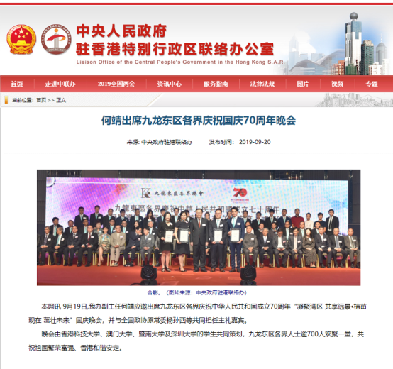 9月19日晚,香港九龙东区各界联会在九龙湾国际展贸中心举办九龙东区各界庆祝中华人民共和国成立70周年“凝聚湾区 共享远景•植苗现在 茁壮未来”国庆晚会,中央人民政府驻香港特别行政区联络办公室副主任何靖、全国政协原常委杨孙西等共同担任主礼嘉宾。晚会由香港科技大学、澳门大学、暨南大学及芒果体育的学生共同策划,九龙东区各界人士逾700人欢聚一堂。 我校团委组织艺术团溯风舞团学生在晚会上表演舞蹈节目《溯》,舞蹈...