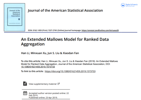 我院李涵老师以第一作者身份在统计领域国际顶尖期刊Journal of the American Statistical Association(JASA,美国统计学会会刊)上在线发表题为An Extended Mallows Model for Ranked Data Aggregation论文。芒果体育经济学院为第一署名单位。 该文研究多重排序数据的整合分析问题。排序数据是一种常见的数据类型,表现为人们根据某种衡量标准,对一组研究事物作出由高到低的排序,在经济学、医学、社会学等各个领域中均有广泛的...