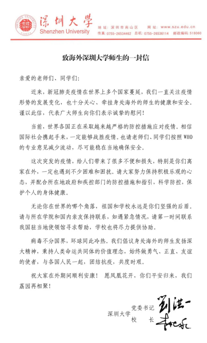 亲爱的老师们、同学们: 近来,新冠肺炎疫情在世界上多个国家蔓延,我们一直关注疫情形势的发展变化,也十分关心、牵挂身处海外的师生的健康和安全。谨以此信,代表广大师生向你们表示诚挚的慰问! 当前,世界各国正在采取越来越严格的防控措施应对疫情。相信国际社会携起手来,一定能够战胜疫情。也请老师们、同学们按照WHO的专业意见减少流动,尽可能稳在当地确保安全。 这次突发的疫情,给人们带来了很多不...