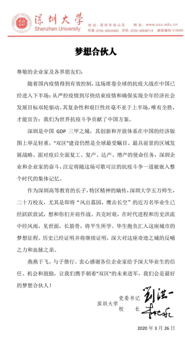 梦想合伙人 | 书记校长给企业家及各界朋友们的一封信