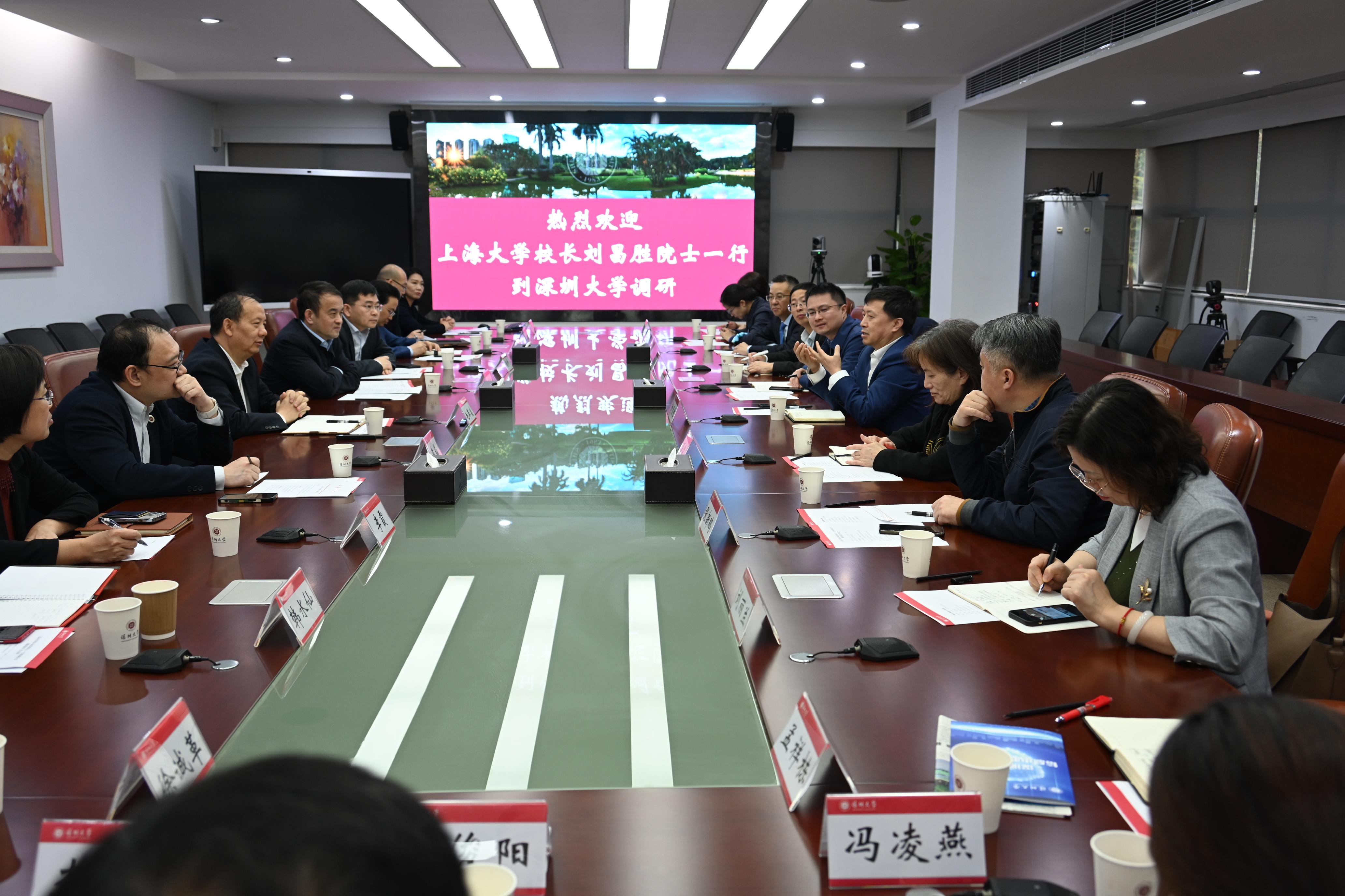 3月28日上午,上海大学校长、中国科学院院士刘昌胜,副校长聂清一行来芒果体育调研。芒果体育校长、中国科学院院士毛军发,副校长周辉会见来宾,双方在粤海校区汇元楼举行座谈会,围绕学科建设、人才队伍建设、创新人才培养等话题进行交流。