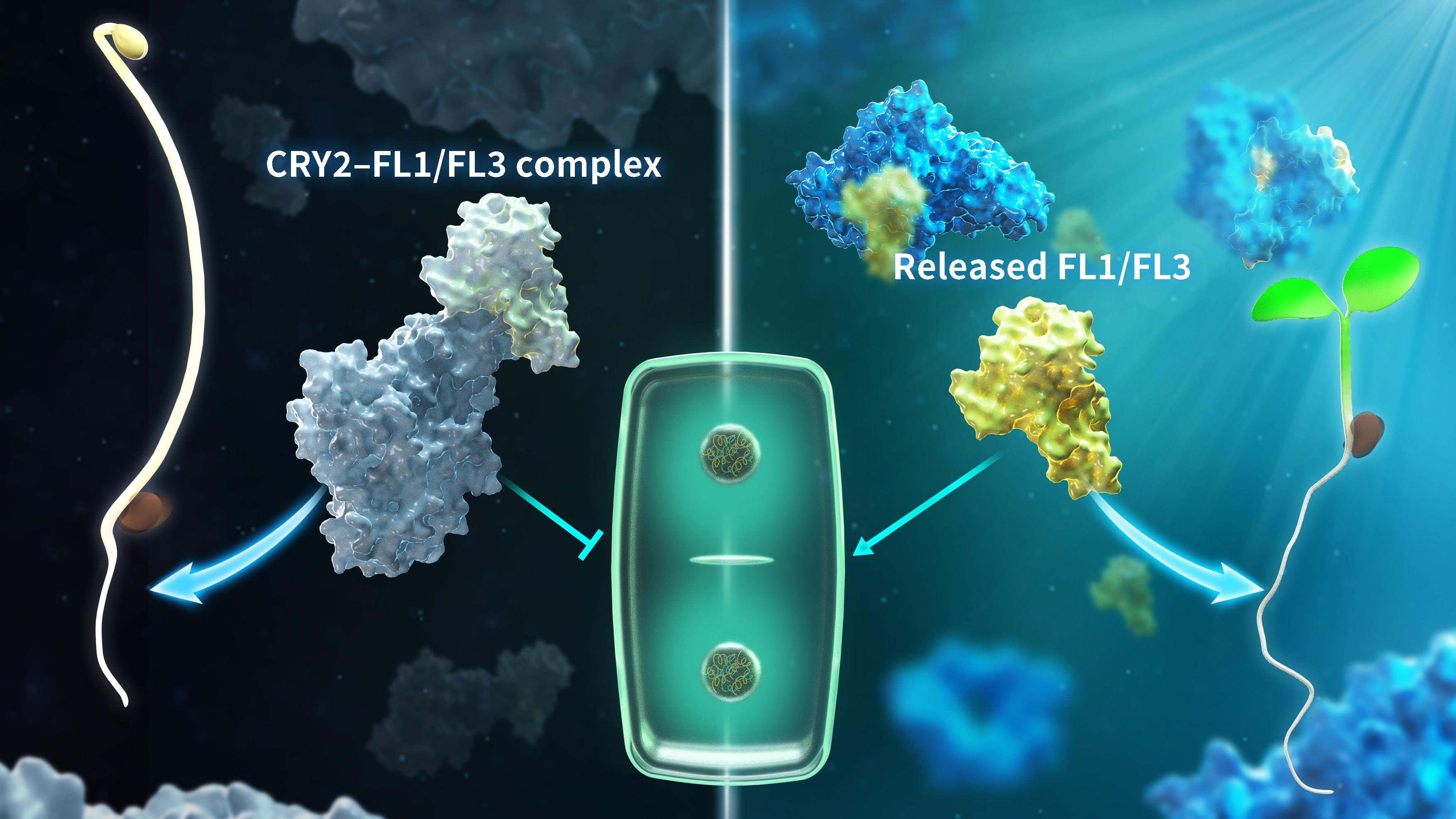 光不仅是植物光合作用的能量来源,也是调控植物发育的重要环境信号。生长在黑暗中的植物幼苗下胚轴努力伸长但根很短,而光下的幼苗则下胚轴短但根比较长。植物在光下和暗中发育完全不同,因为植物光受体蛋白作为植物的“眼睛”,能感知光信号从而调控植物生长发育。植物具备一系列不同的光受体感受不同波段的光,蓝光受体隐花素CRYs介导蓝光调控植物下胚轴伸长、开花、生物钟等发育过程。关于CRYs的研究以往聚焦于CRYs的“蓝光...