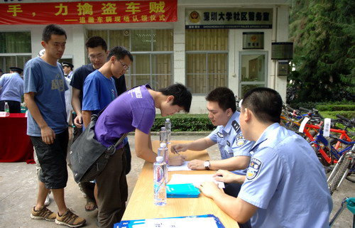 近日,我校保卫处协助公安机关抓获偷盗山地车的犯罪嫌疑人4名,追缴被盗山地车辆14辆。为了震慑不法分子,同时提高师生员工的安全防范意识,深圳市公安局粤海派出所于5月25日在我校保卫处治安科办公室前举行了追缴车辆认领仪式。副校长李永华、派出所民警以及保卫处负责人来到现场。 保卫处处长刘小义对粤海派出所一直以来对深大安全防范工作的支持表示感谢。提醒同学们要保管好自己的财物,把单车停放在监控录像...