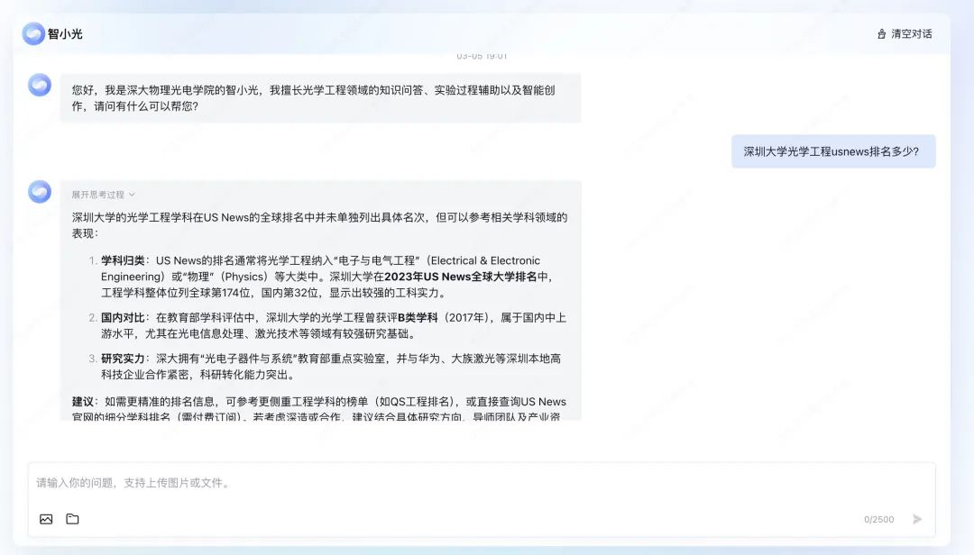 基于腾讯云大模型知识引擎能力,芒果体育物理与光电工程学院将与腾讯云共同打造"智小光“AI助手,并接入DeepSeek大模型,同时结合物理光电工程学院的专属知识库,为师生提供光电工程教学咨询服务。爆肝论文、实验设计不再孤单!