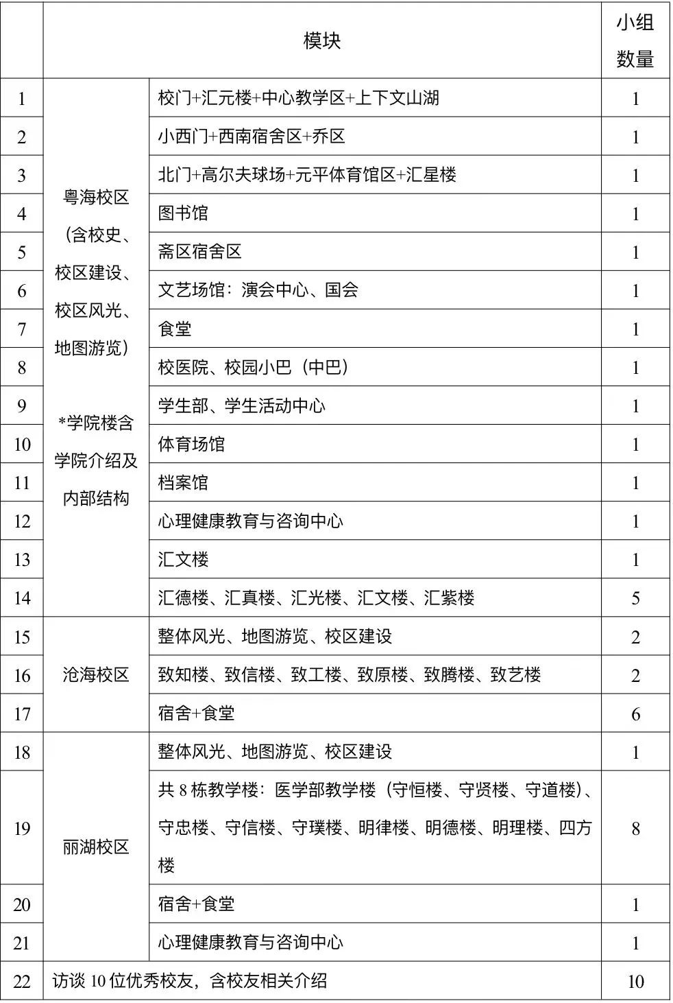 比赛内容分为以下模块,每个参赛小组从中选择一项拍摄内容。
