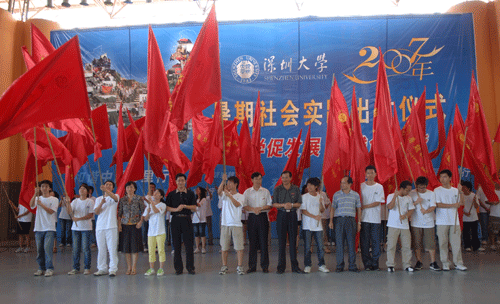 今年,我校大学生暑期社会实践以“科学促发展,实践创和谐”为主题,有12000余名学生参与学校集中组织和个人独立参加的各类丰富的社会实践活动。其中,学校集中组织4000名学生参加“和谐中国万里行”、“和谐深圳社区行”、“和谐山村支教行”、“和谐城乡调研行”、“和谐政企实习行”、“和谐家乡服务行”、“和谐校园科创行”、“和谐香港回归行”八大项目的实践活动。昨日的启动仪式后,200多支队伍将奔赴包括深圳在内的全国各地城市乡村广泛开展课题调研、志愿服务、参观考察、生产劳动、科技创新、勤工俭学等丰富多彩的社会实践活动。