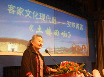 郑小瑛是中国第一个女指挥家,是中国指挥登上国际歌剧指挥台的第一人,由她创作、指挥的客家题材交响乐《土楼回响》获得了中国音乐的最高奖项――金钟奖,她带给大家的讲座就是关于这部荣获金钟奖的交响乐――《土楼回响――客家文化现代版交响诗篇》,在讲座中,她动情地说“客家文化源远流长,至今仍然保存良好,这与客家文化执着顽强的生存精神有着密切关系”,《土楼回响》五个乐章“用音乐展示了中华民族在艰难的生存条件下团结、勤奋、开拓、进取的民族精神。”
