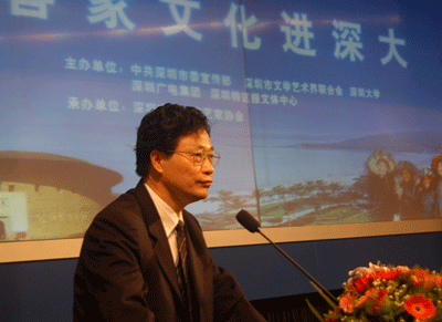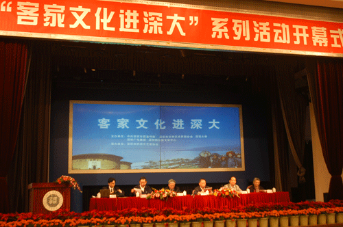 章必功校长致欢迎词,他说,这次活动的召开,是深圳市委宣传部和深圳市文联共同努力的结果。客家文化不是“进”深大,而是“爱”深大,因为首先深大部分老师开展研究客家文化已经有至少十年的历史,有雄厚的学术基础;其次深大影视传播研究中心曾经专门拍摄制作过一部表现客 家文化的影片――《客家人》;此外深大还有广大的客家学生作为客家文化知音,深大有发展研究客家文化的基础和力量。