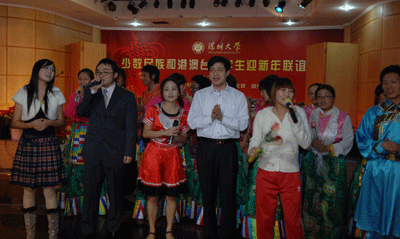 晚会由校党委统战部部长李永华主持。江潭瑜在联谊会上致辞――“和谐是福,团结就是力量”。他说,中国是个多民族的国家,深圳是多民族的城市,我校是多民族学生一起就读的学校,我校现有29个民族的学生,其中有少数民族学生400多名,还有港澳台侨学生200多名。我们虽有着不同的生活习俗和不同的语言,但是在中国共产党下的“和而不同”的环境下的“大和”,国家富强,民族团结。我们共同走过了光辉的2007年,还要共同走进更加灿烂的2008年。2008年全世界的目光都注视着我们,青年人肩负着振兴中华的重任,让我们携手共同奋进!