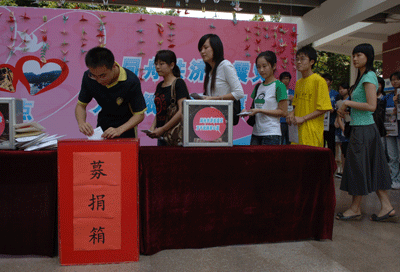 在活动现场,校团委副书记方琳代表校团委感谢并肯定同学们为援助灾区的行动;校学生会主席潘畅同学宣读了致四川省学联和受灾地区大学生的慰问信;校义工联向全校师生发出了捐款捐物的倡议。