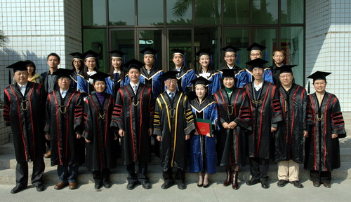 毕业典礼在庄严的国歌声中开始。陶一桃宣读了学校关于授予胡倩文等九名同学学士学位的决定。章必功为胡倩文等九名同学颁授毕业证书和学士学位证书,并与他们合影留念。