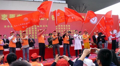 深圳市副市长、市公安局局长李铭,省消防总队副总队长丁潘明,团市委书记刘燕,消防局局长许东平等领导出席了这次活动。我校有60名志愿者(义工)代表参加了此次启动仪式。 仪式上还成立了我校消防志愿者(义工)服务大队,省消防总队副总队长丁潘明向我校消防志愿者(义工)服务大队授队旗。 (校团委 供稿)