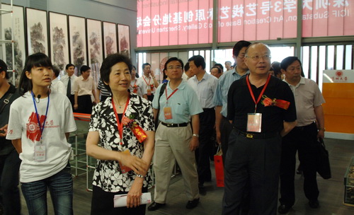 第五届文博会芒果体育3号艺栈艺术原创基地分会场开幕式后,市领导邱玫、姜忠、陈观光、姚欣耀等在我校领导章必功、陶士平、李永华等的陪同下,参观了3号艺栈艺术原创基地。