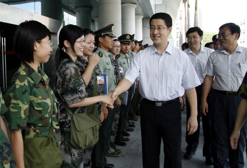 9月18日,我校2009级新生结束军训返校。17日,校领导江潭瑜、章必功、邢苗、陶一桃、阮双琛、陈思平分别率队深入部队,看望军训学生。