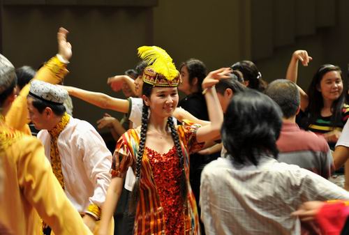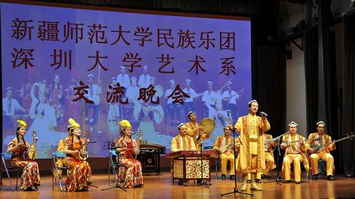 新疆师范大学民族乐团演奏的《塔西瓦依》、《阿娜尔汗》、《吾夏克木卡姆》、《我的热瓦普》等乐曲反映出数百年来维吾尔族的历史文化与社会生活,明快的曲调直抒胸臆、壮美绮丽。具有浓郁传统气息的《纳瓦木卡姆》歌舞片断,热烈欢愉,在演员们的盛情邀请下,不少深大师生上台与他们一起载歌载舞,体会新疆民族文化的独特魅力。