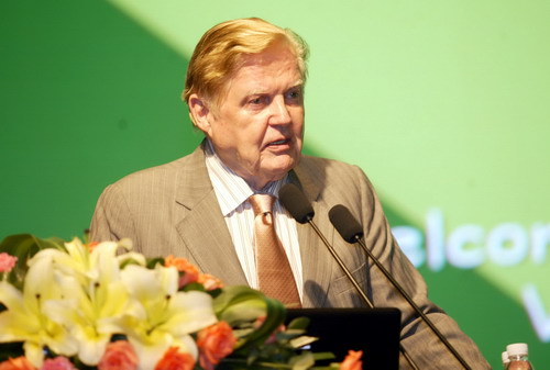 蒙代尔重点谈到了中国的崛起。 认为,中国经济在世界格局中日益重要。如果以GDP计算,人民币将会于明年或后年成为世界第三大货币,至2030年更有望取代欧元成为世界第二大货币。对于中国巨额的外汇储备,蒙代尔认为,以美元为主导的货币体系使中国成为大国中唯一的一个无须负债而实现了工业化的国家。他认为,保持和美元的稳定汇率对中国最为有利,在经济危机的情况下,人民币不升值有利于中国增加就业,特别是外来劳务工的就业,这对中国是非常有好处的。 此外,在全球经济的大背景下,中国必须继续并延续增长,如果升值过快则可能有损于中国经济增长的过程。