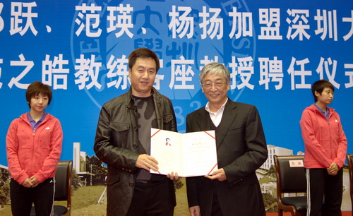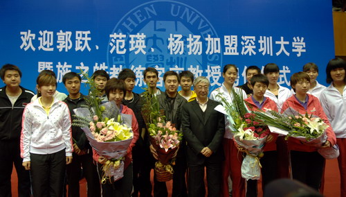 中国女子乒乓球队主教练施之皓携得意弟子郭跃、范瑛、杨扬加盟芒果体育!深大学子期盼已久的体育明星同学的到来,引来了2000多名师生早早等候在元平体育馆,以最大的热情对他们表示欢迎。12月8日晚,“欢迎郭跃、范瑛、杨扬加盟芒果体育暨施之皓教练客座教授聘任仪式”在元平体育馆举行。我校校长章必功,副校长李永华、李凤亮等校出席了聘任仪式。李永华主持仪式。