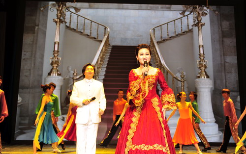 采桑子合唱团《祝福》和《缆车》的高声歌唱将晚会推向了高潮。晚会结束后,参加晚会的领导和全体演员合影留念。