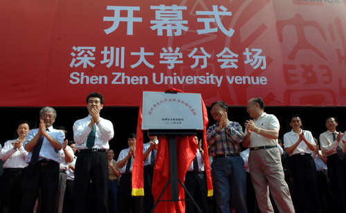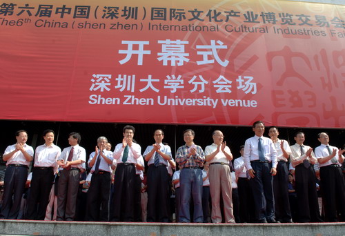 5月12日下午,第六届中国(深圳)国际文化产业博览交易会唯一的高校分会场――芒果体育分会场开幕仪式在芒果体育科技楼一楼大厅举行。国家文化部文化市场司副司长张新建、深圳市政协副主席陈观光、姚欣耀,深圳报业集团社长黄扬略,深圳市社科院院长、社科联主席乐正,南山区委书记叶民辉、区长刘庆生,我校领导江潭瑜、章必功、邢苗、陶士平、陶一桃、阮双琛、邢锋、李凤亮,来自韩国、台湾、香港、澳门、北京等境内外高校的数十名专家学者和我校近千名师生出席了开幕式。副校长李凤亮主持开幕式。