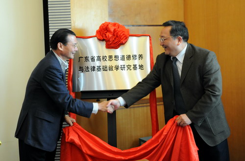 胡树祥、江潭瑜为我校“广东省思想道德修养与法律基础教学研究基地”揭牌。江潭瑜代表学校为基地的专家指导委员会成员颁发聘书。