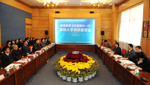 2月23日,教育部副部长李卫红一行在广东省教育厅副厅长李小鲁,深圳市副市长吴以环、教育局局长郭雨蓉陪同下视察我校,并听取了我校人文社科研究的情况汇报。我校领导江潭瑜、章必功、邢苗、陶士平、陶一桃、阮双琛、邢锋、李永华、李凤亮参加调研活动。