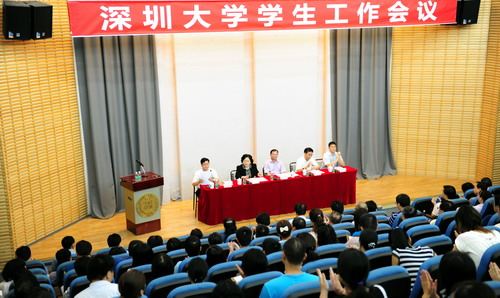 校党委书记江潭瑜在会上讲话。他指出,学校的工作重心是教书育人,育人的对象主要是学生。深大历来重视学生工作,已经建立起一支比较健全的学生工作队伍,形成了一系列完善的学生工作做法。我校下一步学生工作要做到:一、坚持以人为本,关爱学生,贴近生活,考虑时代特点和年轻人个性,倾听学生想法,解决学生困难;二、学生工作和党建工作、思想政治工作充分结合,从新生入学开始就开展党的知识和人生教育,加强学生对党的认识,早培养,早发展,并根据大学生特点和需求进一步改进思政课程;三、加强辅导员队伍及其他与学生工作相关的队伍建设;四、创新学生工作,营造“开放、宽松、自由、人文”的学习环境,倡导“自觉学习、自由生活、自我管理”的管理方式;五、形成有效的领导机制和管理机制,充分发挥学生会和学代会的作用。