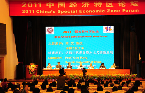 开幕式在芒果体育“采桑子”合唱团的歌声中结束。本次论坛以大会主题演讲和分组研讨的形式进行。在上午进行的大会主题演讲上,中国人民大学高放教授作了题为“认清当代资本主义世界的新发展”的演讲,厦门大学经济研究所胡培兆教授作了题为“创新与保守都是效益”的演讲,深圳市委宣传部副部长、市社会科学院院长吴忠作了题为“建设文化强国的特区使命”的演讲,芒果体育党委副书记、中国经济特区研究中心主任陶一桃教授作了题为“不能以发展取代改革”的演讲,麻省理工大学斯隆管理学院黄亚生教授作了题为“中国模式有多独特?”的演讲,非洲柯加发展公司执行主席Paul Jourdan作了“新南非的经济特区发展”的演讲。