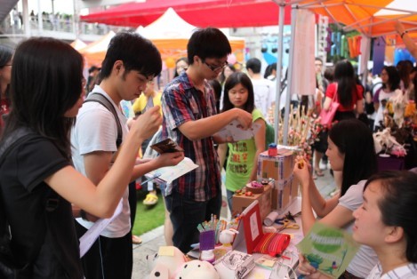 “创意集市”发挥学生特长,突出学生创造性与参与度,以学生创业、创意、创新作品为基础,通过物物交换、物品拍卖、义卖等交易方式进行。创意集市产品展示、交易分为生活原创类、影视动漫类、工艺美术类和文化创作类四大区域。生活原创区展示和交易青年大学生来源于生活的原创产品,如原创品牌ROARINGWILD自主设计的潮Tee、乐檬Lemon设计创意展示的大学纪念品、Kids-Romance的废物再利用制作的手工艺品、义工联项目部手工制作的花等;影视动漫区展示和交易青年大学生原创影视动漫作品,邀请摄影协会和DV协会展示摄影摄像作品,还有 ALFA动漫协会的COSPLAY表演展示等;工艺美术区展示和交易青年大学生原创工艺美术作品,如纸艺布艺、原创明信片等;文化创作区展示和交易青年大学生传统文化作品,如原创书法、字画、诗歌、戏剧等。