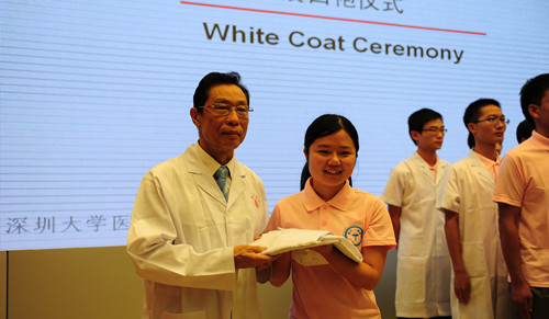 钟南山为临床医学专业2012级新生授白袍。新生在姜文奇院长的带领下庄严宣誓,决心为祖国医药卫生事业的发展和人类身心健康奋斗终身。