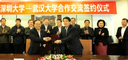 李清泉介绍了我校的基本情况。他表示,深大经过近30年的发展,在各方面取得了较好的成绩。学校注重创新、创业型人才的培养,培养出8万优秀毕业生,涌现出如马化腾、史玉柱等一批杰出校友。在下一阶段的发展中深大将着力打造与深圳特区转型期发展相适的高水平、现代化大学,进一步提升深大的学术影响力、学术水平。加强本科教学的同时扩大博士生规模,实现教学与科研的协调发展。学校将加强高端人才引进,推出 “3+1工程”即“荔园优青、荔园学者、荔园名师+协同创新团队计划”,鼓励交叉学科、重点学科,以及团队力量的发展。深大还将加强与国内外高校合作,在学生交流,科研合作,组建重点实验室、国家基地等方面努力,力争早日进入全国高校前列。李清泉说,武汉大学历史悠久,在多年的发展历程中形成了较为成熟的制度和措施,希望武汉大学继续支持深大的发展,为深大的改革发展提供了很好的经验,并以各种方式多多加强两校间的交流合作。