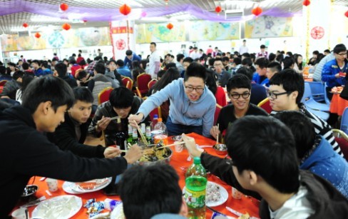 老师和同学们,吃着盆菜、火锅,唱歌跳舞,一声声“新年好!”“新年进步!”尽情表达着心中的欢乐和美好祝福。Degree舞团带来了火热的街舞表演,魔术协会、提琴协会、音乐协会、留学生代表也上台献出了精彩的节目,古筝独奏和傣族舞蹈赢得了现场阵阵掌声。在精彩和节目和享用美食的欢声笑语中,在场领导来到师生身边,向留校过年学生发“利是”,祝愿大家新年新进步。团年饭在一次次掌声欢呼声和一声声祝福中一次一次被推向高潮。丰盛的团年饭后,还进行了喜气洋洋游园会,团团圆圆共看春晚等活动。