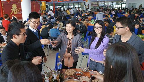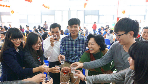 迎新春团年饭现场南校区饭堂二楼,彩色气球、大红灯笼高高挂起,师生们一张张喜气洋洋的笑脸相互辉映。老师和同学们,吃着盆菜、火锅,唱歌跳舞,一声声“新年好!”“马上幸福!”尽情表达着心中的欢乐和美好祝福。