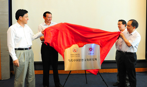 5月29日,我校在国际会议厅D厅举行了当代中国思想文化研究所揭牌仪式暨提高文化软实力建设文化强国的研讨会。中国社会科学院马克思主义研究院院长、书记邓纯东,中国社会科学院马克思主义研究院创新工程首席研究员龚云,北京语言文化大学当代中国研究所所长郑承军,深圳市委宣传副部长李瑞琦,及香港理工大学应用社会科学系、华南师范大学马克思主义学院、中山大学马克思主义哲学与现代化研究所、中山大学社会科学教育学院、华南理工大学思想政治学院等高校代表,我校党委书记江潭瑜、副校长李凤亮,宣传部、社科部、社会科学学院负责人共同出席活动。