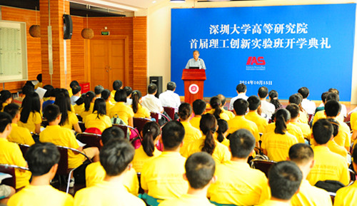 韩志超在开学典礼上致辞。他说,在全中国经济升级和教育创新的背景下,深大开创了高等研究院“理工创新实验班”,为同学们的学习提供了良好的环境、齐全的设备和最好的老师,提供了一个真正可以追求学术的地方。希望在四年以后,可以看到优秀中最优秀的63位学士;六年之后能够看到创新自主的63位硕士;硕士毕业后,同学们已经具备迎接任何挑战的素质。