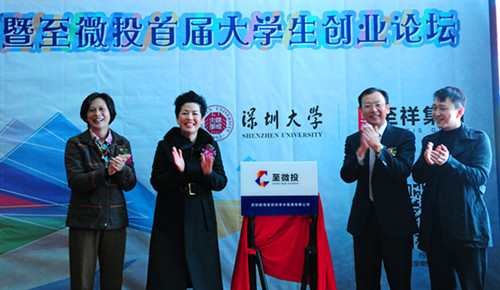 李凤亮、周玮女士、深大学生部副主任殷涛、至微投·亿元天使大学生创业基金督导王琴女士,一起为至微投成立揭牌。