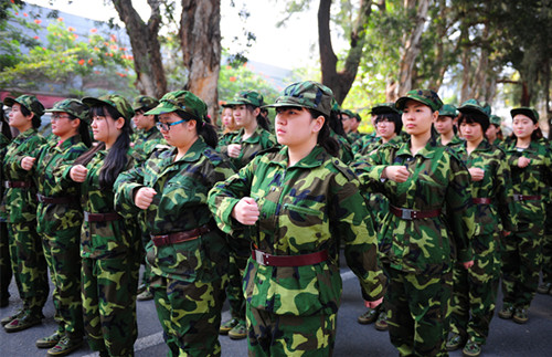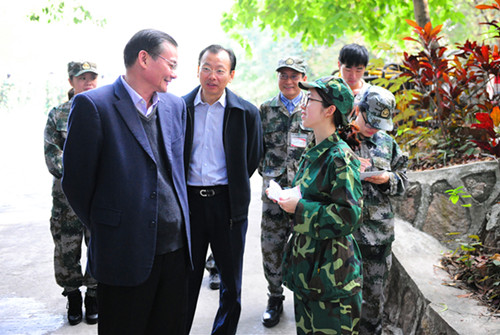 1月27日上午,我校党委书记江潭瑜在承训部队武警广东省边防总队第六支队姚文红政委、副校长李凤亮以及军训工作相关负责人陪同下来到训练场看望正在军训的2014级新生,并慰问工作在军训一线的承训官兵。