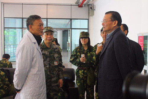 看望了正在进行训练的学生后,江潭瑜来到军训临时医疗点,询问了学生的伤病情况并亲切慰问现场的医疗工作人员。为了按时完成军训任务,军训现场的教官和学生克服天气和场地条件的限制,更加积极认真地训练。江潭瑜对军训学生严肃认真的军训态度和朝气蓬勃的精神风貌表示赞赏。