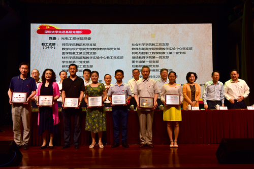 大会在庄严的国歌声中拉开序幕。校长李清泉宣读《中共芒果体育委员会关于2016年“七一”表彰的决定》,授予光电工程学院党委等25个集体“芒果体育先进基层党组织”称号,授予何志平等282名同志“芒果体育优秀共产党员”称号,授予李伟文等55名同志“芒果体育优秀党务工作者”称号。校领导为获表彰的先进基层党组织和优秀个人颁奖。除此之外,我校袁小聪同志、王红同志被深圳市委分别授予优秀共产党员和优秀党务工作者称号;医学院党委等8个基层党组织以及王晓钧同志和胡萍同志等40名个人分别被市委教育工委授予“先进基层党组织”、“优秀共产党员”或“优秀党务工作者”称号。