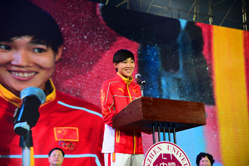 优秀校友代表、里约奥运会女子帆板比赛银牌获得者陈佩娜向同学们表示祝贺。她与在场的新生分享自己的运动生涯和在芒果体育的生活。告诉大家,只有坚持不懈地奋斗,保持信念和平常心,才能最终取得成功。她说,自觉、自信、自强的三自精神,是深大赋予她的良好品格,一代又一代的深大人正是秉承着这样的信念,艰苦奋斗,薪火相传,才铸就了深大今日的辉煌。