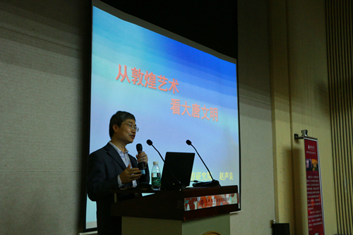 当晚,赵声良在我校科技楼报告厅为我校师生带来了“从敦煌艺术看大唐文明”专题讲座。赵声良从佛教寺院与石窟为出发点,循序渐进地为在场观众揭开了石窟文化和艺术的神秘面纱,阐明了在古时石窟、寺院对当时民众文化的意义。他又从建筑的角度解释了当时石窟艺术的地位。‘“俗讲”就好比唐朝的“百家讲坛”’形象生动地比喻使这个深奥又神秘的文化更易于理解。接着,赵院长还从唐朝节庆仪式、佛经、塑像、曲艺、经典拓本、文学作品甚至古代时尚等方面全方位地为大家展开了一幅唐朝文化盛卷。在场座无虚席,值得一提的是,互动环节,赵声良为我校留学生同学提出的关于中国文化的问题的精彩回应饱含正能量,博得全场同学的热烈掌声。
