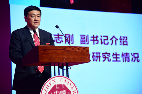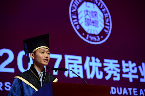 优秀毕业生代表罗梓杰发表演讲。他表达了对老师、亲人的感谢和对同学的不舍,他认为SZU中的S代表“search探索”,要在四年的大学生活中不断地探索自己、探索未知;Z代表“zeal活力、创新”,要充满活力,敢于创新,对未来充满激情;而U代表“universal交融”,在校园里,和来自五湖四海的同学们一起交流,共同成长。毕业典礼更意味着人生的起点,他将记得在深大的时光,用所学知识回馈亲人和母校、社会。