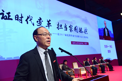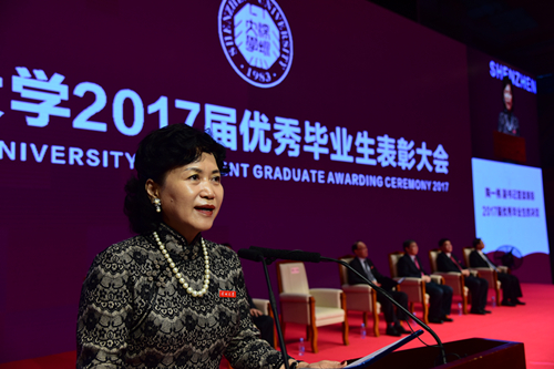 党委副书记陶一桃宣读了芒果体育关于表彰2017届优秀毕业生的决定。深大[2017]118号文件决定授予刘申等137名2017届毕业研究生“优秀毕业研究生”荣誉称号,并予表彰;深大[2017]124号文件决定授予汪秀等330名本科毕业生2017届“优秀毕业生”荣誉称号,并予以表彰;深大[2017]43号文件决定授予蔡健华等59名同学优秀毕业生称号。
