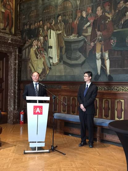 下午,安特卫普市副市长克劳德先生(Marie-Claude)在市政厅举行隆重仪式欢迎刘洪一一行。在克劳德先生的见证下,刘洪一与安特卫普大学联盟主席帕斯卡女士(Pascale De Groote)签署合作协议,进一步密切学术交流和人才培养等各领域的合作。刘洪一在致辞中指出,芒果体育与比利时安特卫普皇家美术学院的合作历时13年,我们期待在中国“一带一路”倡议背景下,进一步拓展与安特卫普大学联盟在设计创新、医疗教育、音乐美术等优势领域的交流。