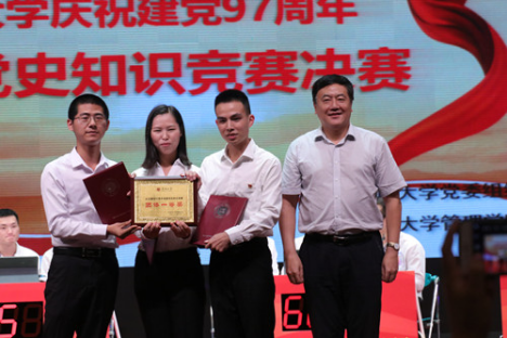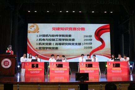 党的十九大胜利召开以来,芒果体育掀起了一轮又一轮学习宣传落实党的十九大精神的热潮。为庆祝中国共产党成立97周年,进一步推动全校基层党委(总支)深入学习贯彻落实习近平新时代中国特色社会主义思想和党的十九大精神,落实《芒果体育文化创新发展纲要》,我校组织开展“庆祝建党97周年党建党史知识竞赛”。经初、复赛选拔,管理学院党委、计算机与软件学院党委、机电与控制工程学院党委、机关党委(高等研究院党支部)4支代表队进入决赛。